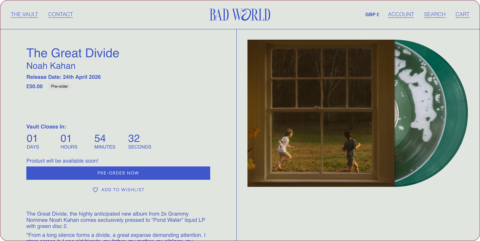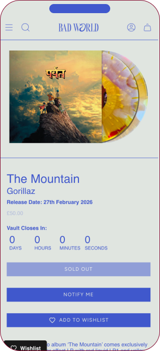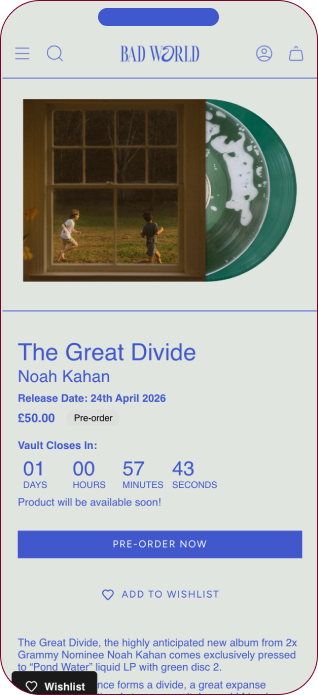 • Added in product countdowns as part of Bad World’s limited shopping system, where records are only available for purchase during specific time periods. After, the system automatically switches to a email-signup notification system
